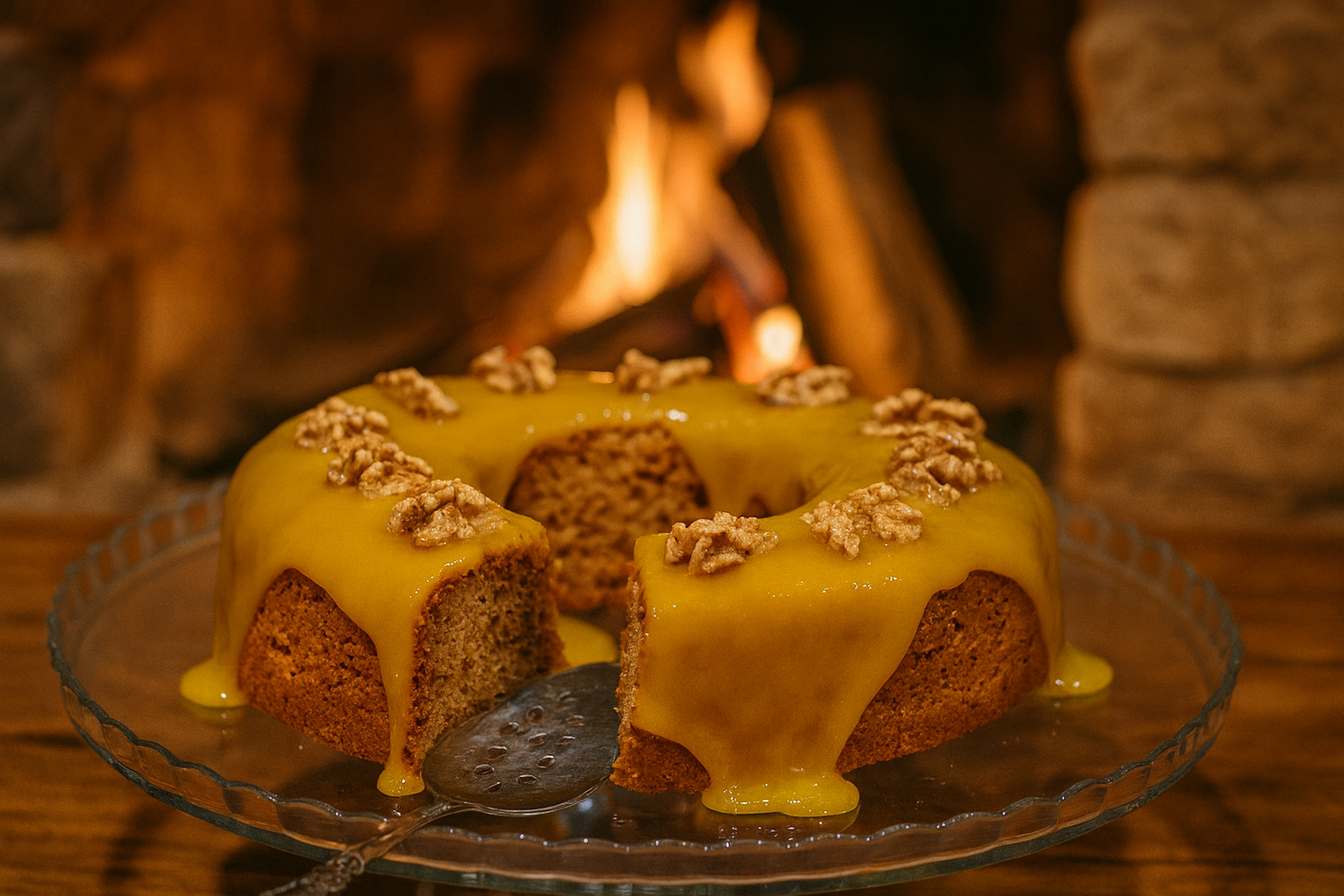 Um bolo rico, húmido e aromático, feito com nozes moídas que lhe dão textura e sabor profundo. A cobertura de doce de ovos torna-o irresistível e perfeito para ocasiões especiais.
