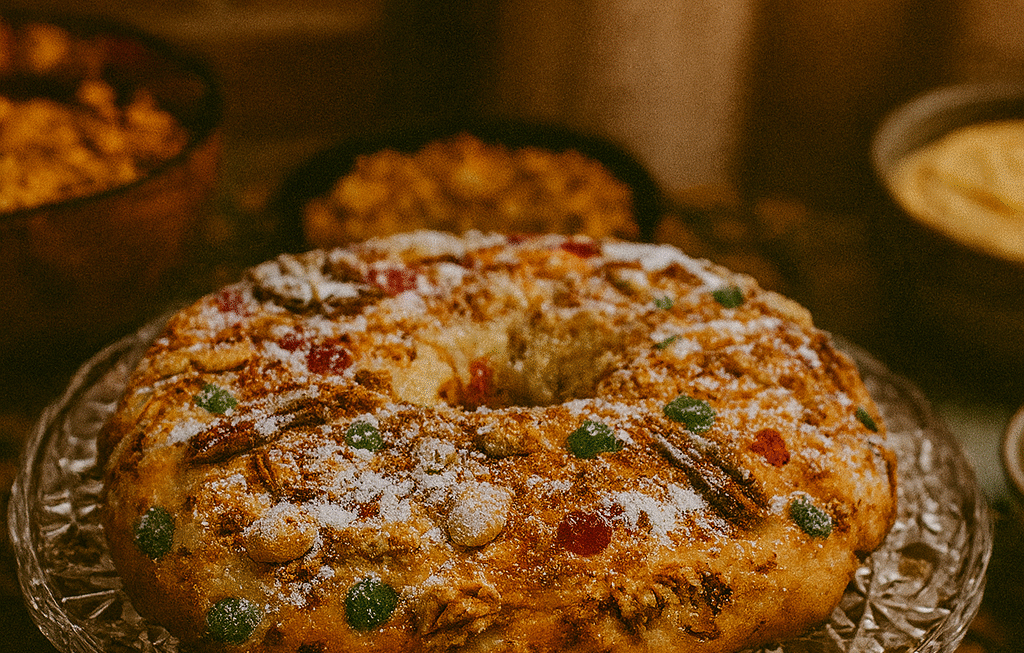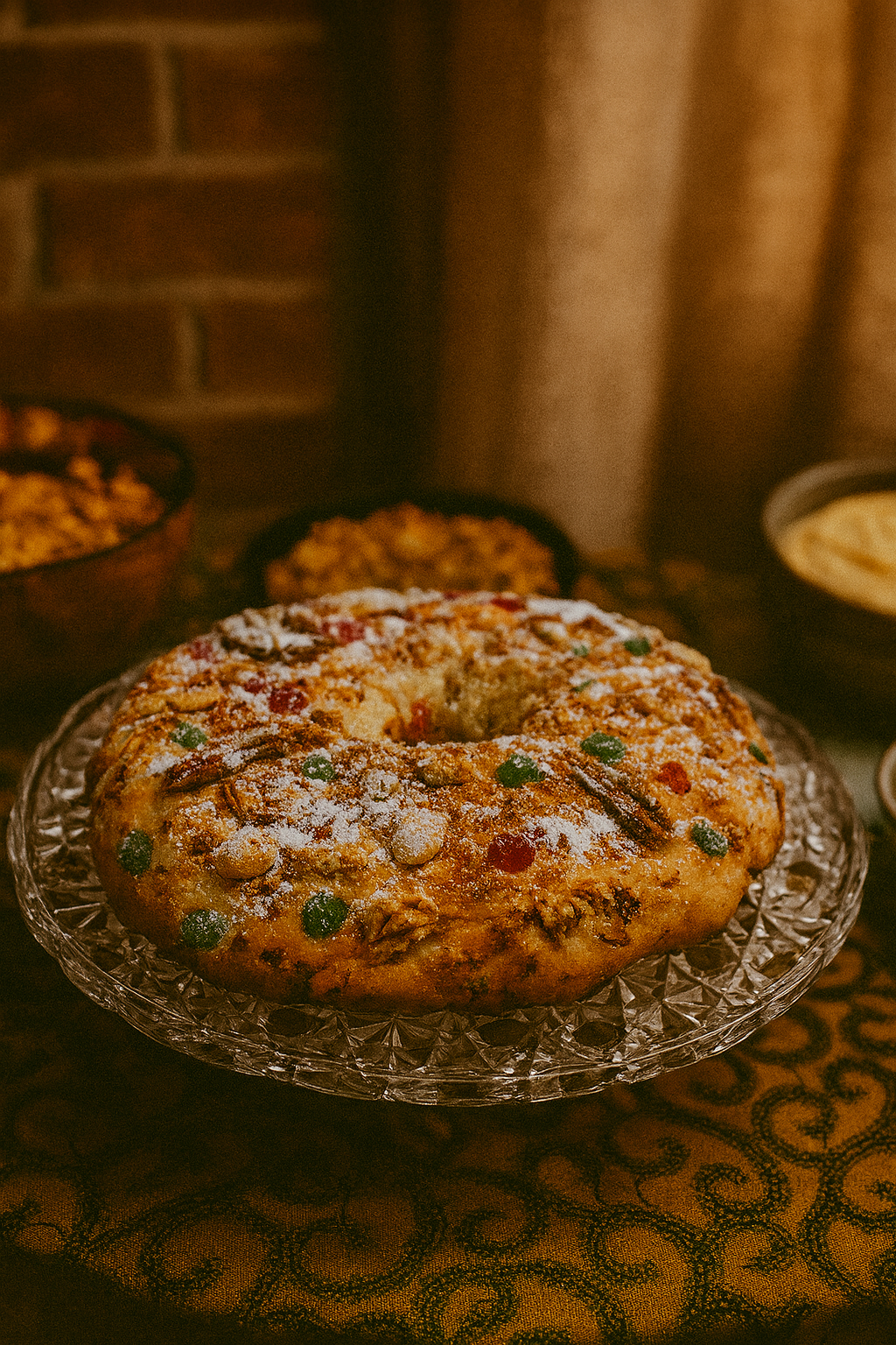 Um Bolo Rei tradicional, macio por dentro, aromático dos citrinos e do rum, com muitos frutos secos e cristalizados. Aquele clássico de Natal que deixa a casa a cheirar a festa ✨