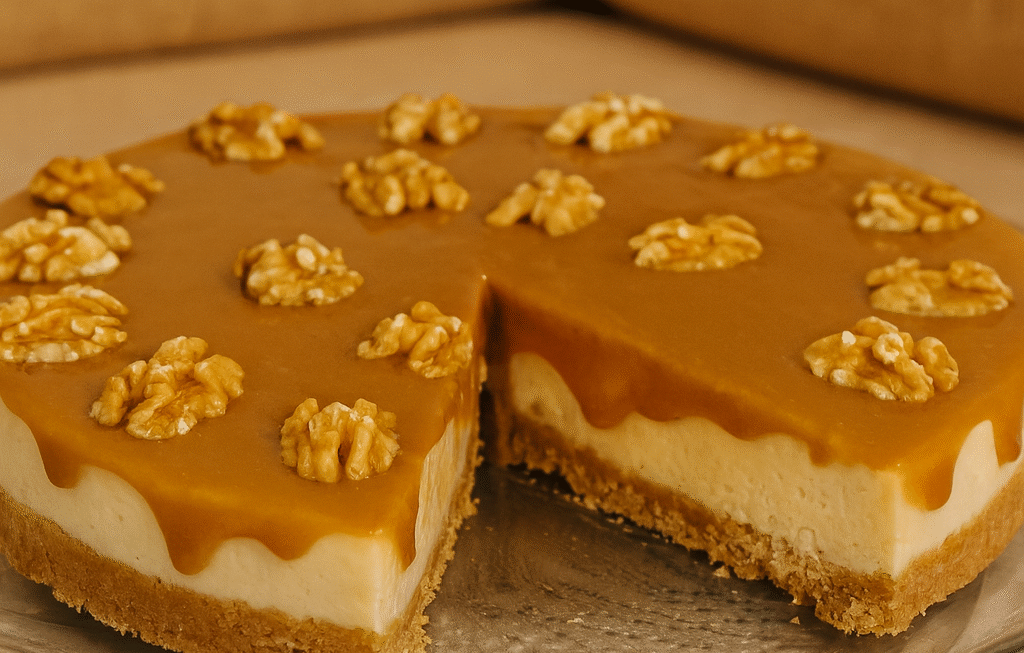 - Espalha o caramelo morno sobre o cheesecake já firme.