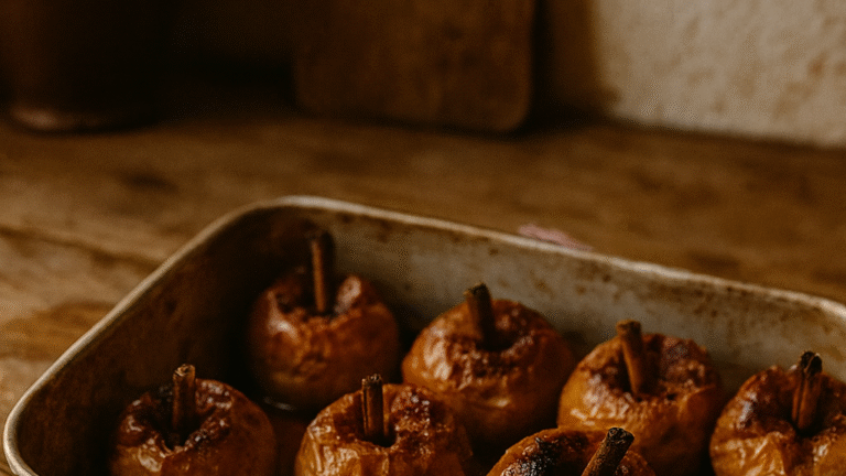 Maçãs assadas lentamente no forno, recheadas com canela e açúcar amarelo, regadas com Vinho do Porto e rum, que se transformam num xarope espesso e aromático. Um doce de conforto total — simples, elegante e com aquele cheirinho irresistível de cozinha caseira.